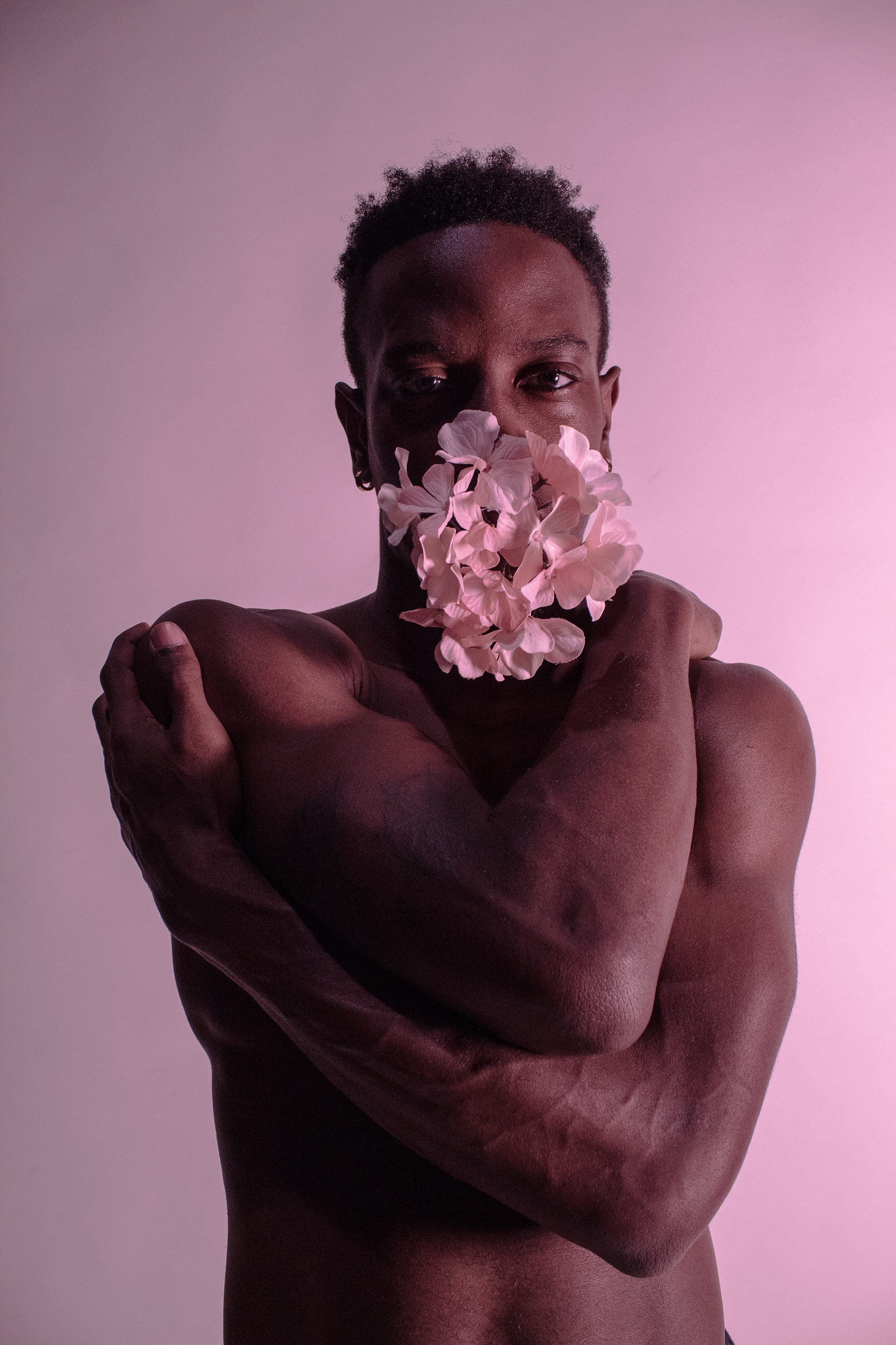 A photoshoot playing with color and body composition and poses. I wanted to capture the softness and texture of skin and the flowers in contrast to a masculine body.